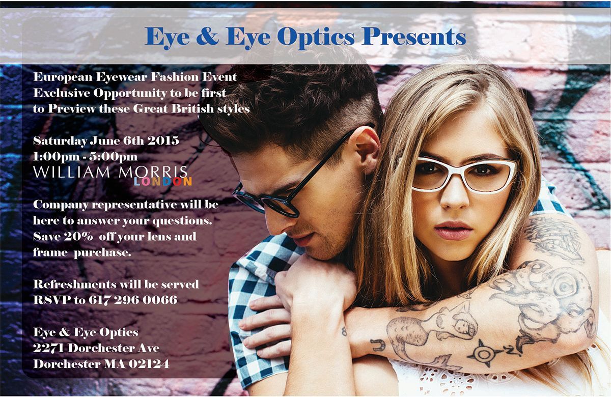 Update : Eye and Eye Optics is hosting an event that you don’t want to miss! On Saturday, June 6 th from 1 pm until 5 pm, you can preview the newest eyeglass styles in Britain from William Morris London. A company representative will be there to answer questions, and they will offer 20% off lens and frame purchases. Refreshments will be served. RSVP to (617) 296-0066 .