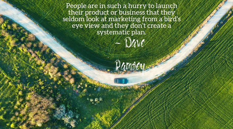 People are in such a hurry to launch their product or business that they seldom look at marketing from a bird’s eye view and they don’t create a systematic plan . ~ Dave Ramsey
