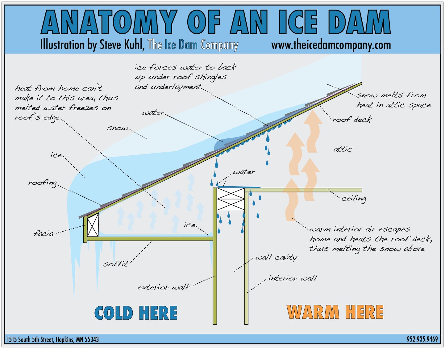 Prevent ice dams. Ice dams form when warm air leaks through your roof and melts the snow, which refreezes when it reaches the roof’s cold overhang. This causes water to back up and leak into the home, ruining walls, ceilings and insulation. Fortunately, this damage is preventable by ensuring that your roof is properly insulated and ventilated. Center-Point Energy and Energy Star are good resources for show how to do the project yourself. Or, for trusted businesses in the area that can help with insulation, visit Superpages .