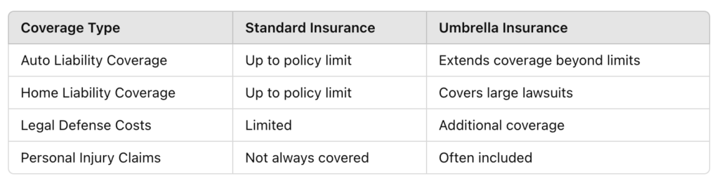 Umbrella insurance acts as an extra layer of protection beyond your home, auto, or renters insurance. If a lawsuit or accident results in costs that exceed your policy limits, umbrella insurance covers the remaining amount—so you don’t have to pay out of pocket.